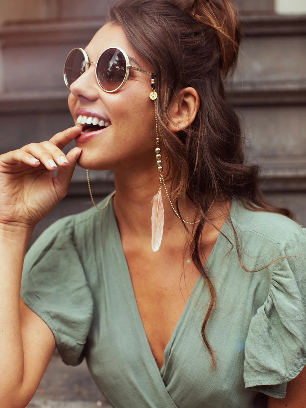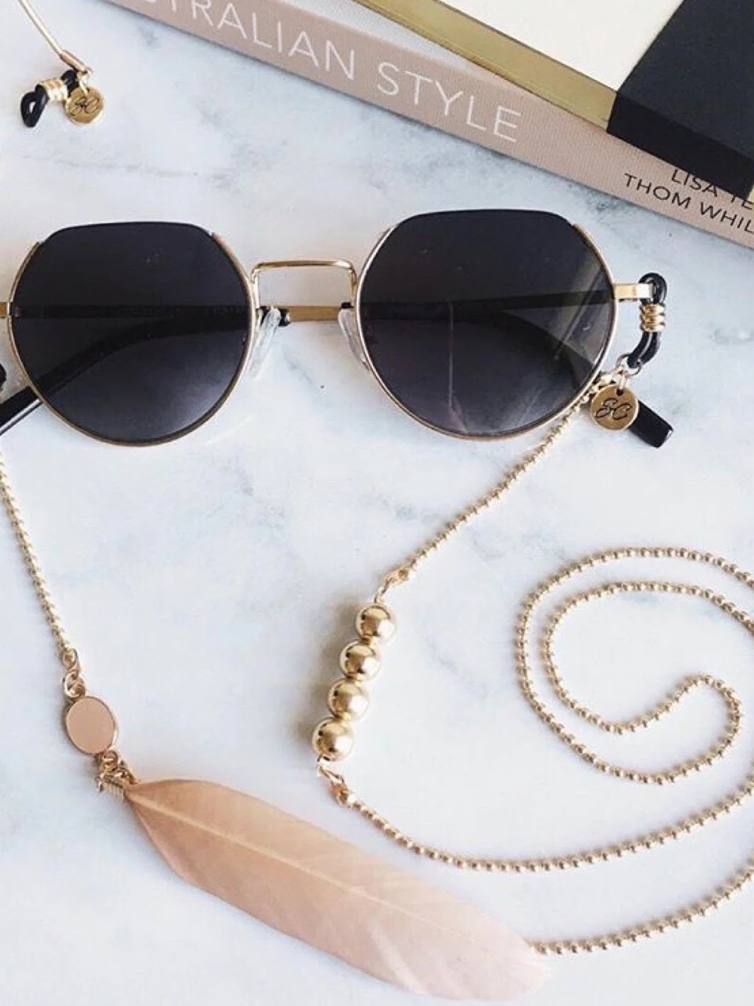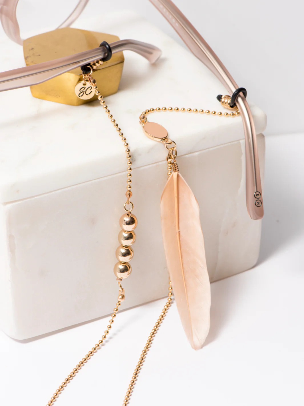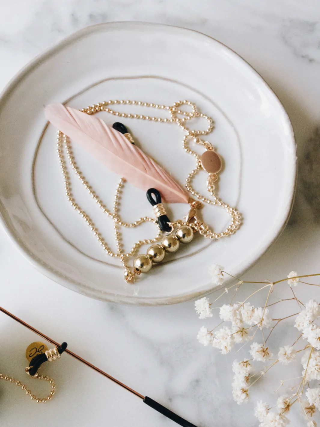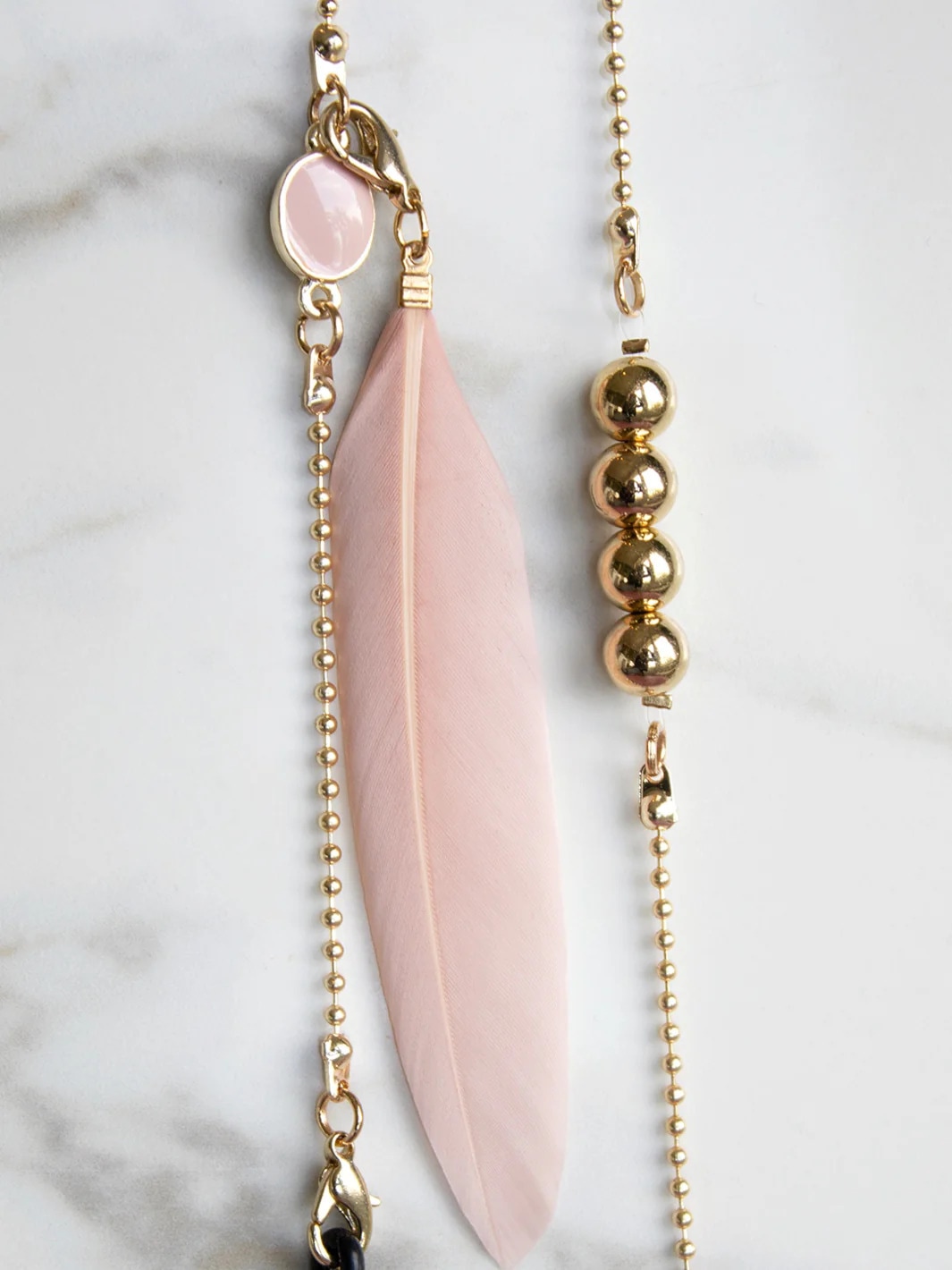 フェザーがエフォートレスでありながらトライバルな雰囲気を醸し出し、愛らしさもあるガーリーなサングラスチェーン。フェザーは取り外し可能。