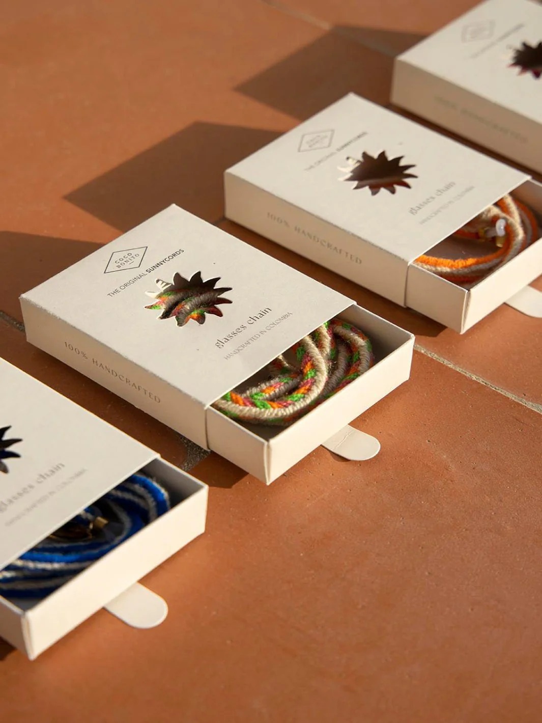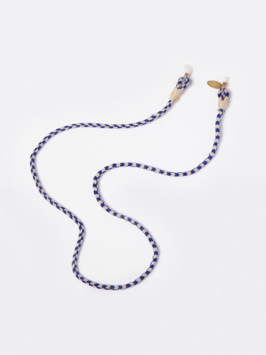 伝統的なトレンサド・フィンガー・ループの技法を使って、手編みしたアイウェアコード。スポーツや、お気に入りのお出かけに最適です。